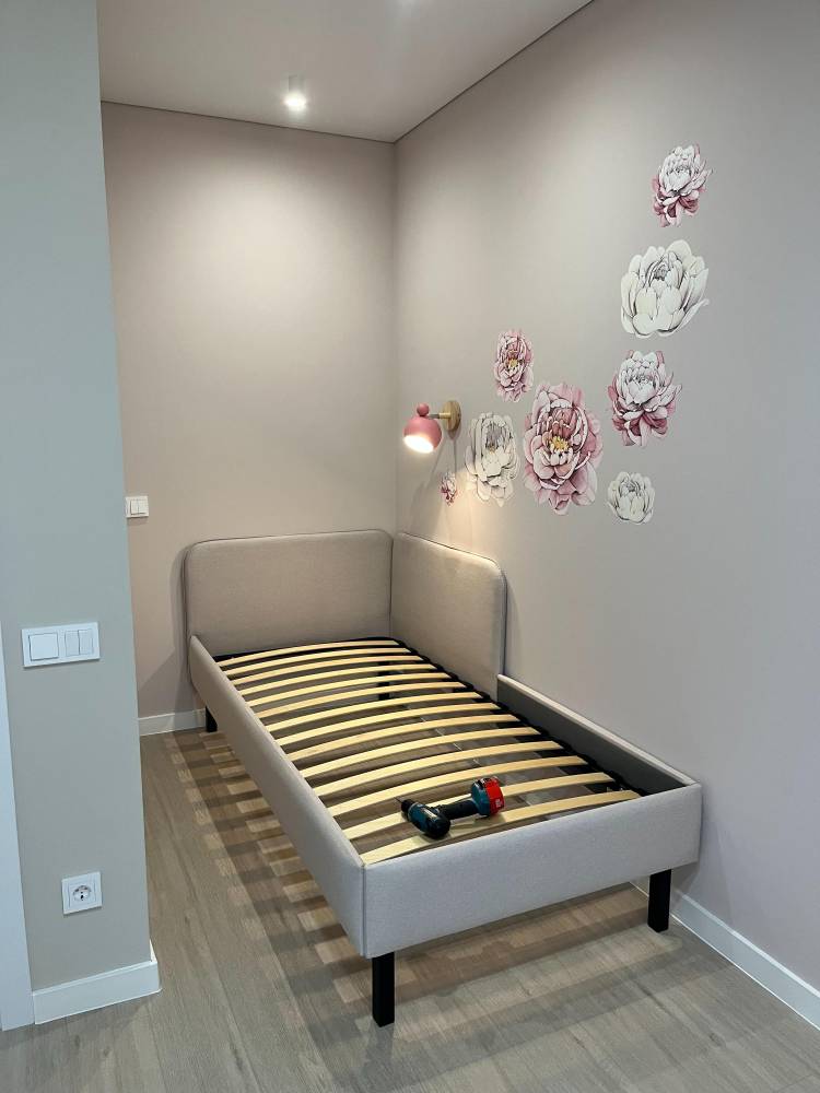 - Обивка кровати выполнена из мебельной ткани.